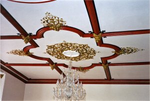 The ceiling photographed covers the original which is fragile and thus needed protection. The dining room mentioned above used to be the ballroom of the house but when I was there it was a multi-functional place complete with climbing ropes, a drop down gymnastics bar and wallbars. All has now changed and the whole place has become converted to flats.