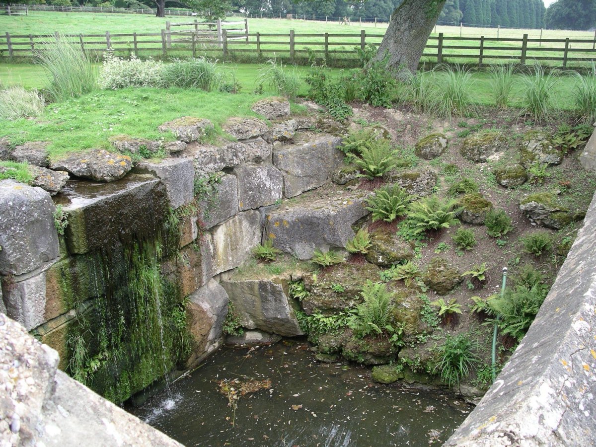 The date ascribed to this work is c1871, and it is sadly obvious that the waterfall must have deteriorated quite a lot over the years. One would normally expect its face to be adorned with Pulhamite rockwork, but these have weathered away, and one can now only see the remains of those on the banks and under the bridge.