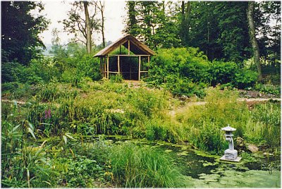 When the Channel 4 television team got to Gatton, the Japanese Garden was completely overgrown after many years of neglect, and a lot of work was needed to restore it. They managed to get some replica lanterns made, and one of them is shown in the foreground of Fig 2, which was taken at the time of my visit about a year or so later. This indicates that the original may well have come out of the Pulham Manufactory, as can be seen if one compares the lantern in this picture with their Okayama lantern, shown in Fig 33.1 in the book. The hut, or ‘tea house’, is a very rough and simple, open-sided structure, with a light roof supported on a wooden frame, and there is also a rustic wooden bridge – not shown here.