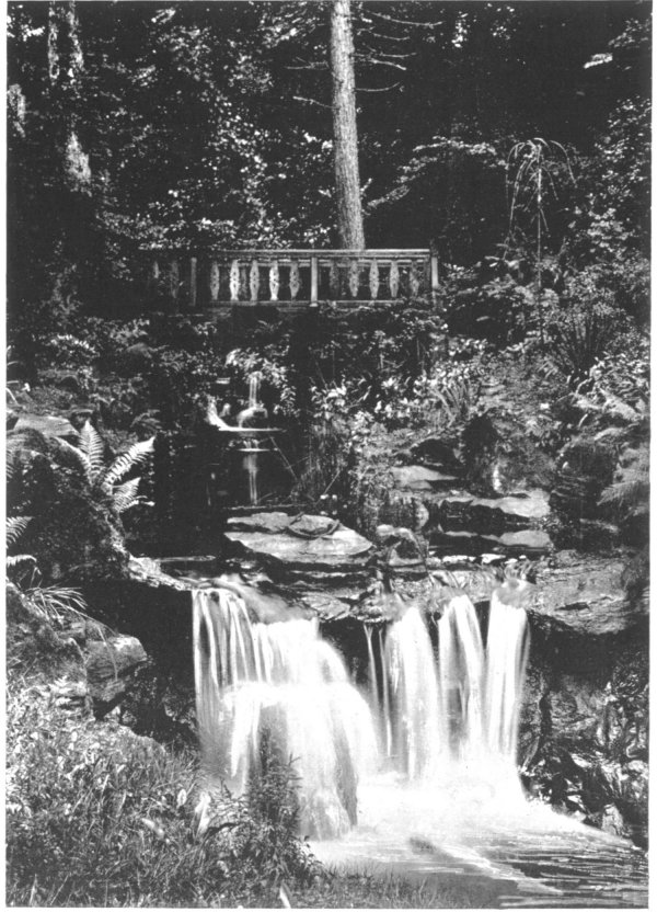 ‘On the west side one of the most interesting features is the rose garden and lily pond, the pond fed from a wall fountain by way of a narrow canal which was constructed with a number of side recesses, planted with iris and reeds. The feature my client most appreciated is the rocky stream which enters the gardens to the north and passes southward beyond the line of the rose gardens until it loses itself in the artificial lake below. The rock-builders were fortunate in having to hand an abundance of picturesque moss-grown rocks, which they handled with great skill, to construct the cascades, pools, and the Alpine gardens. In this work we had the able assistance of Mr. Pulham, who continues the sterling reputation of his father and grandfather as rock-builders. . . .’