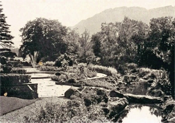 The most prominent feature here was the Rock Garden, which centres around two burns – crossed and re-crossed by a network of gravel paths and stepping-stones – that snake down the hill, and finally converge in a large fish-filled pond at the bottom. Mawson was also asked to help make more of the Racers Burn – an unassuming burn that was originally a small stream that ran from the hill above Mount Stuart to the sea – and the result was the creation of a series of pools and spectacular cascades that are said to replicate the Via Dolorosa – the route of Christ’s suffering and death. It stretches from the shore to the Calvary pond at the top of the hill, and was described by Mawson as ‘indeed a spot for meditation’.[iii]