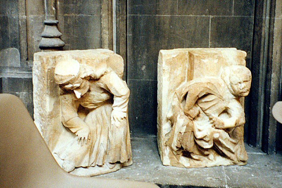 These figures represented the various types of merchants and working-class people who would have populated the town in those days – i.e., stonemasons, chandlers, blacksmiths, merchants, beggars and the like – and their original intention would have been to illustrate how the prosperity of the town – and its Kings and Queens – had been built upon the work and support of ‘the common man’. This probably explains their stooped postures, indicating the heavy burden of toil and responsibility that they carried on their shoulders.