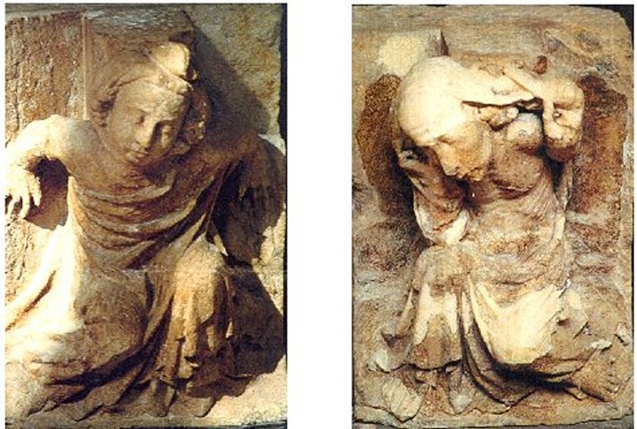 Four of these figures are shown in Fig 5. The picture of the two at the top was taken during my visit, when all the blocks were lined up on the floor along the side of the church. The rows of chairs in front of them show that they are each about the size of very thick 2-foot square paving blocks. Two more of the blocks are shown separately below.