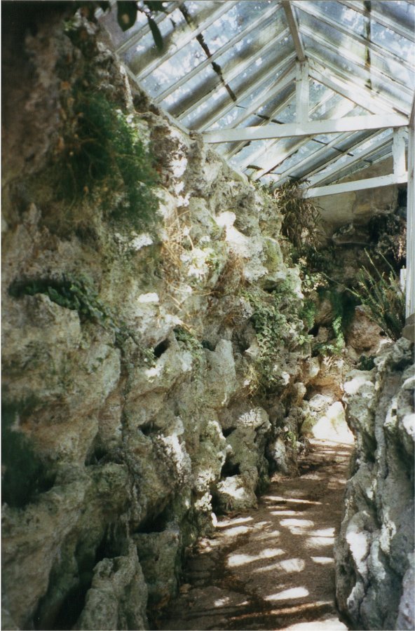 ‘The fernery has vast walls of an artificial tufa-like material made into an impressive complex of cliffs, buttresses, planting pockets, subterranean pools and stalactite-like structures, stuck here and there with larger pebbles at the back to give the impression of the wall being a different material. The house is heated in winter and, being extremely humid, the surfaces are covered with mosses and liverworts beneath a tapestry of ferns and Begonia rex. In the circular area, water passes beneath a concrete bridge and a gap in the stonework forms a skylight hung with trails of Ficus pumila, whilst the wall side of the corridor is lined from floor to ceiling, about 2.4m, with the same material modelled into numerous small plant pockets. The half-glazed side, opposite, has a lower but otherwise similar arrangement.