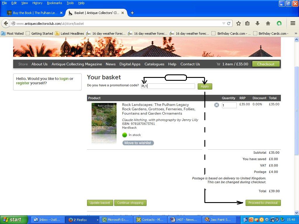 - Enter the code ‘PL1’ in the ‘Promotion Code’ box at the top of that page, and click on the ‘Apply’ button. This updates your invoice with the 25% ‘Promotion Discount’, bringing the net price of the book down to £26.25. Click on the ‘Proceed to Checkout’ button.