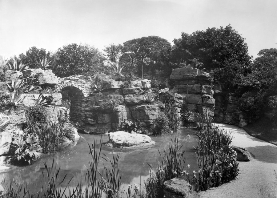 The first project was on the Tulip Patch, at the top of a hill a short way away from the Manor, where they built brick caves, covered with natural rocks, in which to house the goats, and the second was the Water Garden, opposite what is now ‘The Dairy’. The massive rock structures there – which include a huge archway reminiscent to those at Madresfield Court – were mostly of Pulhamite, and they also built a small artificial lake and some more ‘goat grottoes’ so that the goats could be moved away from their original home on the Tulip Patch. The third section was around the Aviary, near the house, where they built a series of massive grottoes and caverns etc.