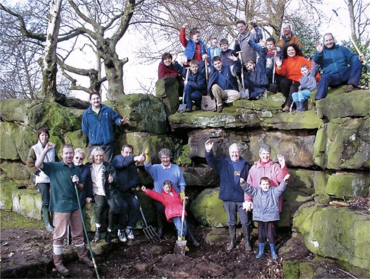 James 2’s waterfall, cascades, rocky bank and chasm were allowed to become completely overgrown, but, over recent years, the Friends of Mesnes Park worked tremendously hard to remove the overgrowth, and clean up the site, and a ‘People and Places Award’ from the British Trust for Conservation Volunteers was used to help with its complete restoration – in fact, I am delighted to be able to say that my confirmation of the work’s provenance in 2000 proved to be a major factor in helping to secure the grant. Fig 1 shows the top of the cascade just after its clearance, and Fig 2 shows a group of ‘Friends’ celebrating its completion.